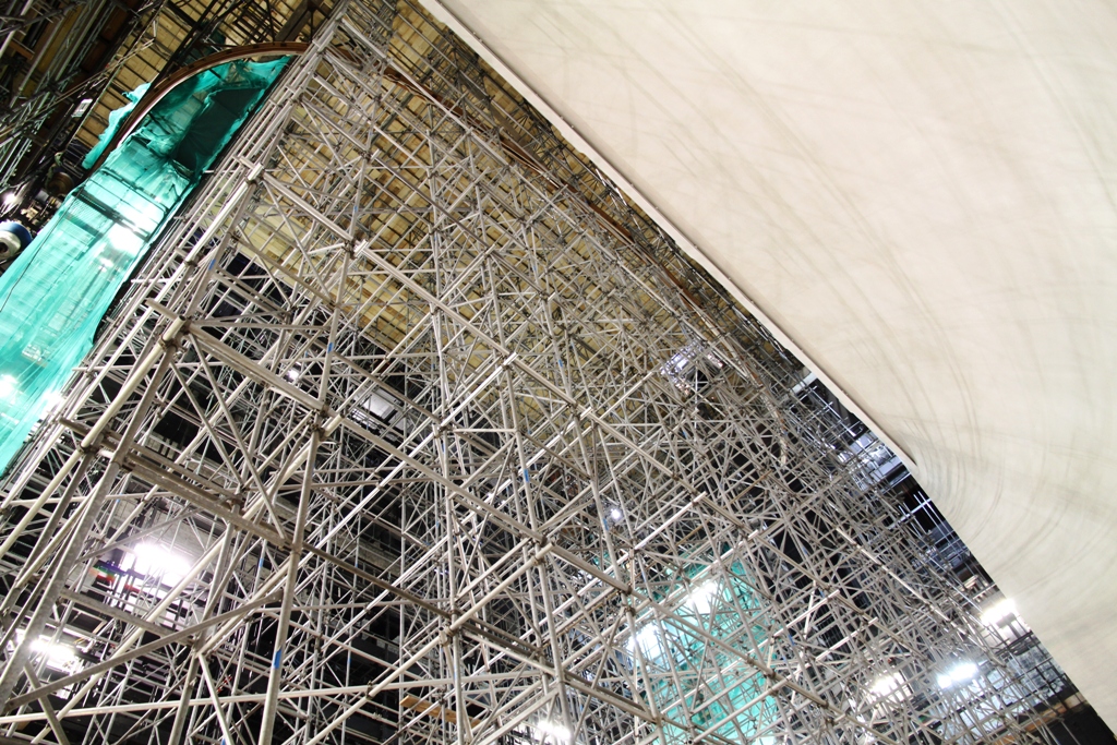 systemungebundene Stahl-Rohr-Kupplung Gerüstkonstruktion im Druckraum als Traggerüst durch die vorhandenen Stuhlöffnungen zur Aufnahme der Gitterträgerbrücken. Ausbau und Erweiterung dieser mit einem systemungebundenen, ausgeschraubten Stahl-Rohr-Kupplung Leergerüst bis ca.2,00m unter die Decke zur Aufnahme von abgetreppen Gerüstebene. Ausbau vorbenanntes Gerüst im Bereich der Brüstungen zum Bearbeiten dieser.