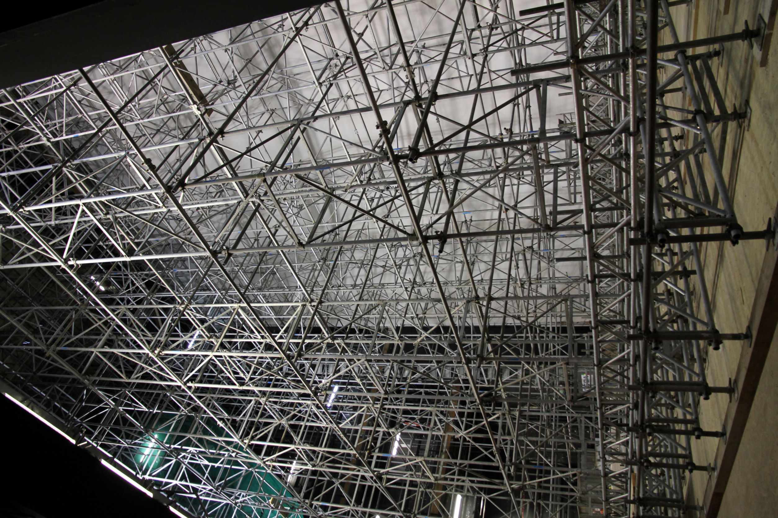 Traggerüst nach Statik mit zusätzlicher Lastverteilung, als Leergerüstkonstruktion mit Personenlastenaufzug und Schwerlastgerüstplattform.
