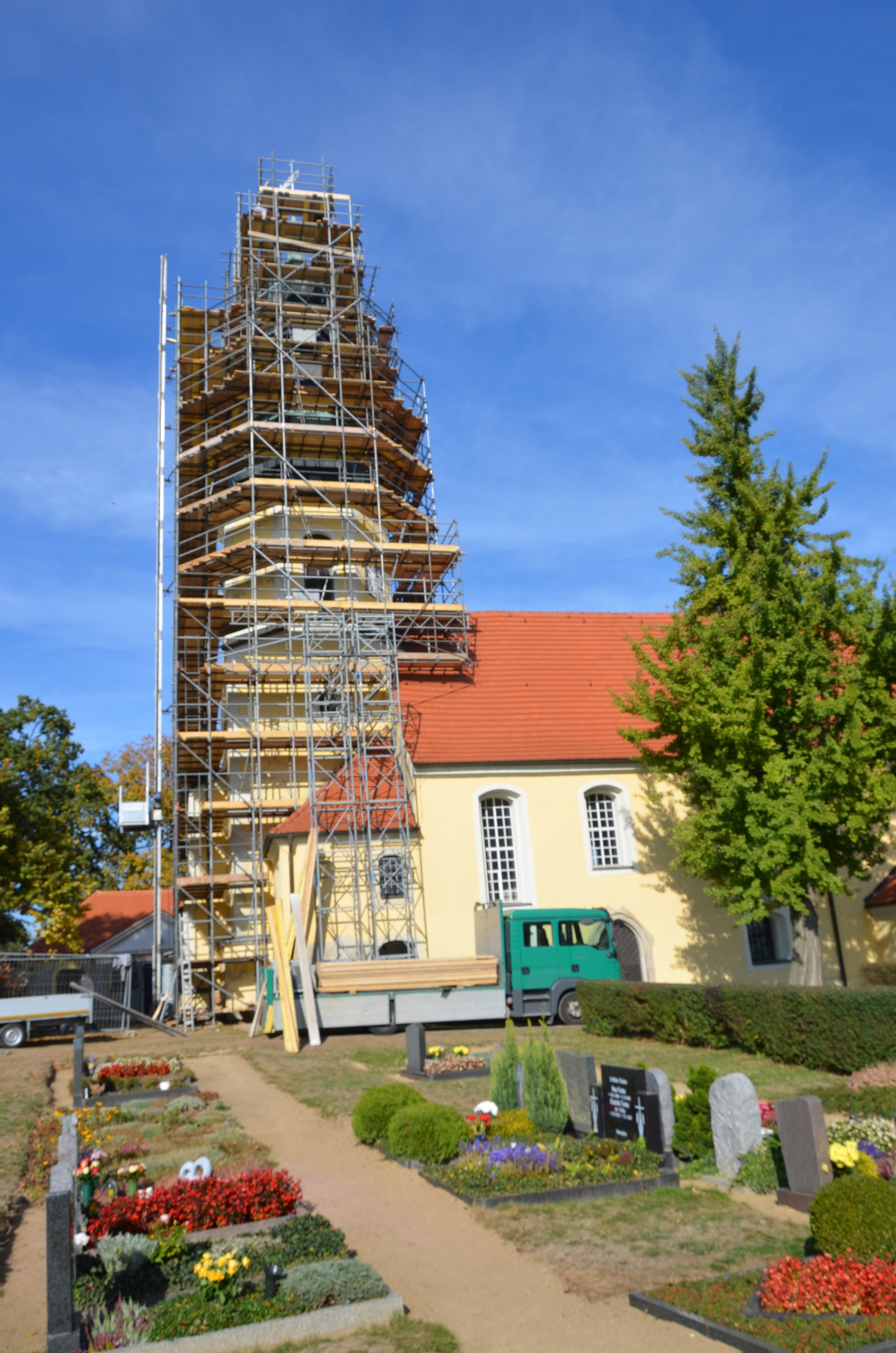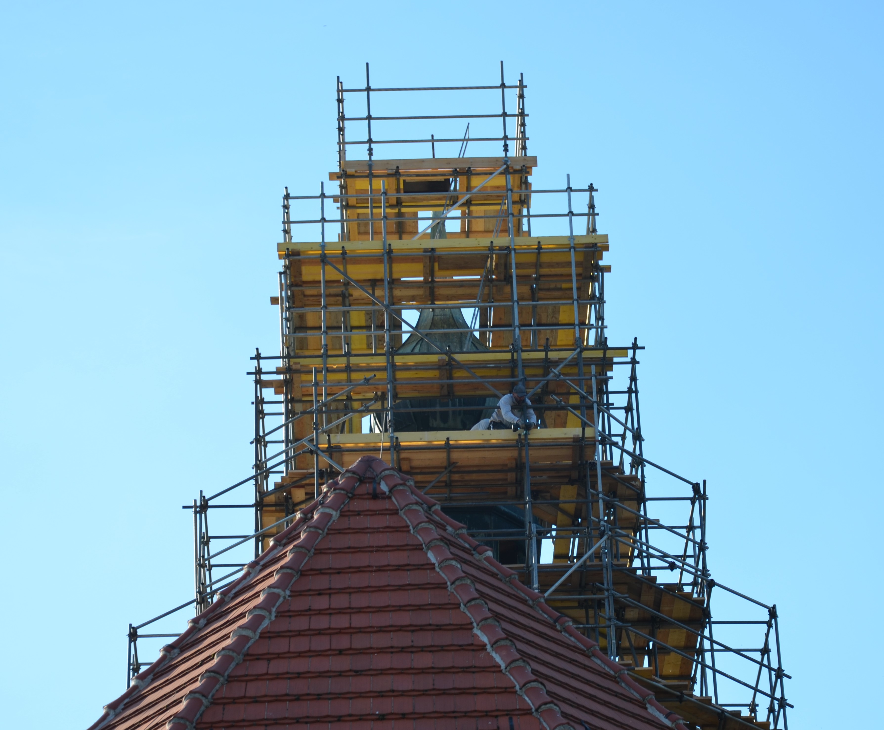 Turmgerüst Goldbach, systemungebundene Stahl-Rohr-Kupplung Konstruktion mit Ausleger- und Hänge- Gerüsten über den Dachflächen.