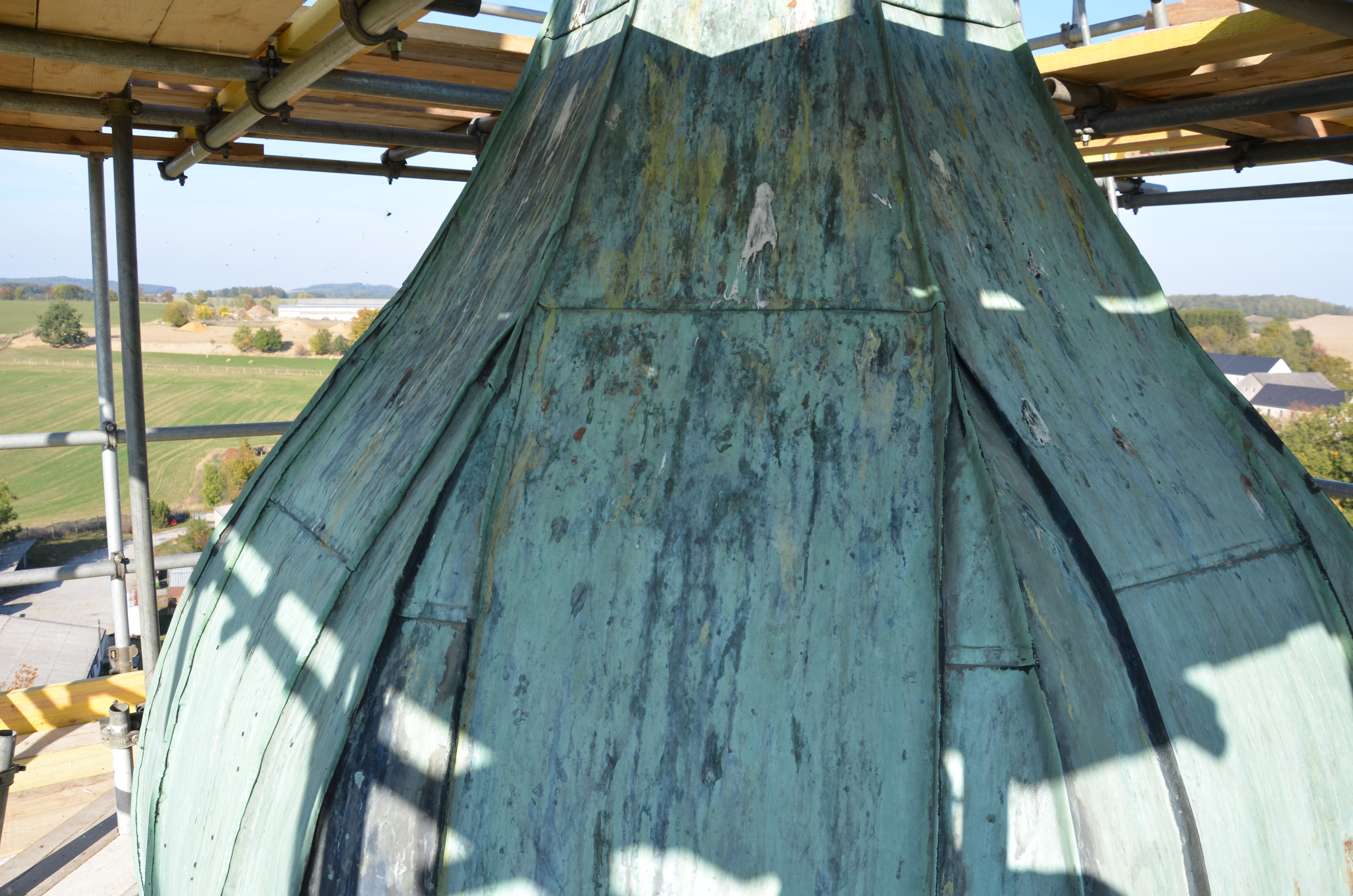 Ab der Traufe unverankerte, selbstaustrebende, gitterträgerlose Konstruktion bis zur Bekrönung.