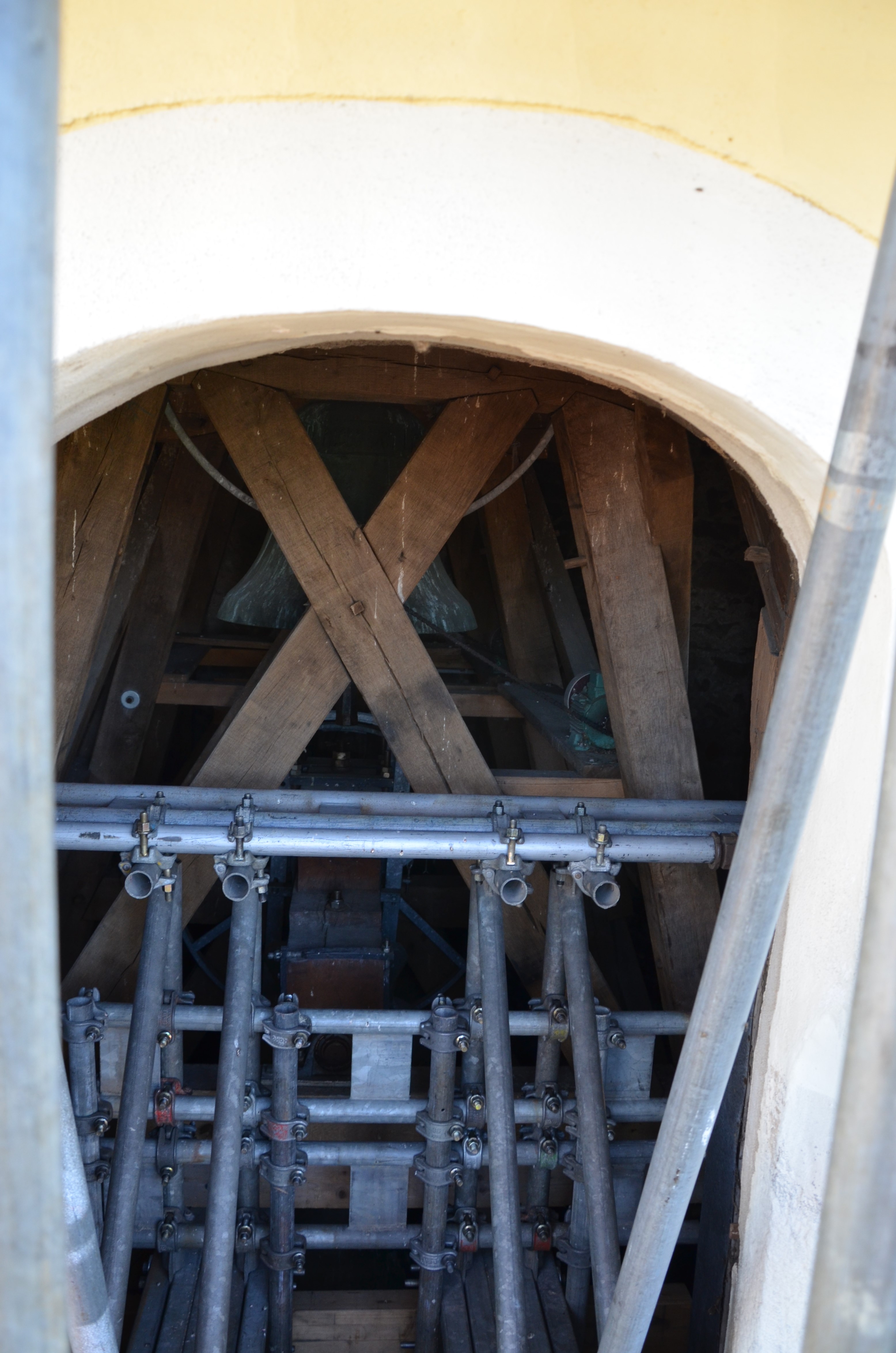 Der Glockenstuhl inkl. Deckenbalkenlage wurde tlw. als Gegenlager genutzt. Das Geläut bleib trotz der Eingriffe voll funktionsfähig.